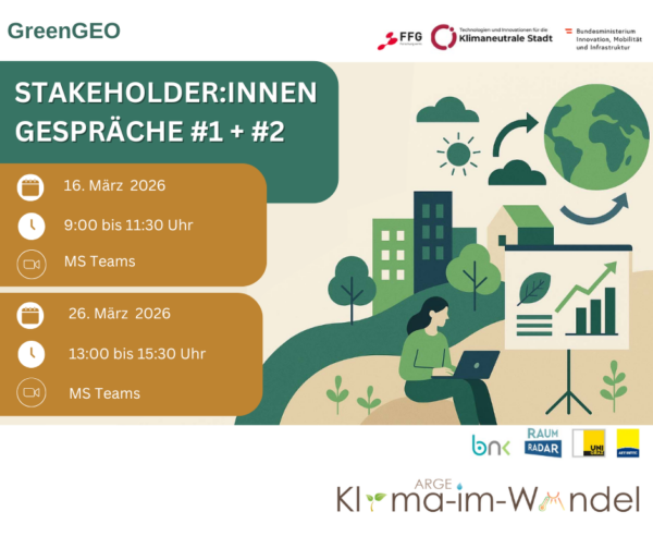 Im Projekt GreenGEO, das im September 2025 gestartet ist, konnten bereits in der ersten Projektlaufzeit wesentliche Grundlagen zu lokaler Klimarisikobewertung und datenbasierten Maßnahmenvorschlägen für die Raumplanung erarbeitet werden, die nun weiterentwickelt und im Rahmen von zwei Stakeholder:innen Workshops vorgestellt und gemeinsam diskutiert werden. |